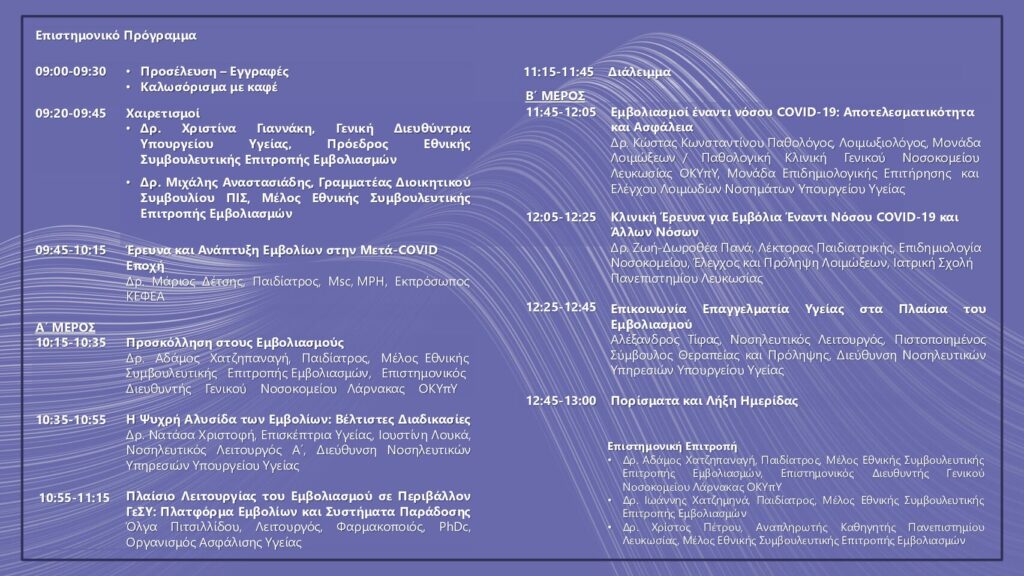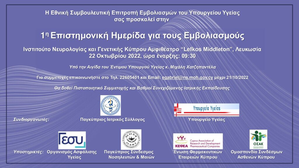 Η ΚΕΦΕΑ υποστηρίζει και θα συμμετάσχει στην 1η Επιστημονική Ημερίδα για τους Εμβολιασμούς, η οποία διοργανώνεται από την Εθνική Συμβουλευτική Επιτροπή Εμβολιασμών του Υπουργείου Υγείας. Η Ημερίδα θα πραγματοποιηθεί στο Αμφιθέατρο “Lefkos Middleton” του Ινστιτούτου Νευρολογίας και Γενετικής Κύπρου στη Λευκωσία, το Σάββατο, 22 Οκτωβρίου 2022 και τελεί υπό την Αιγίδα του Υπουργού Υγείας κ. Μιχάλη Χατζηπαντέλα.